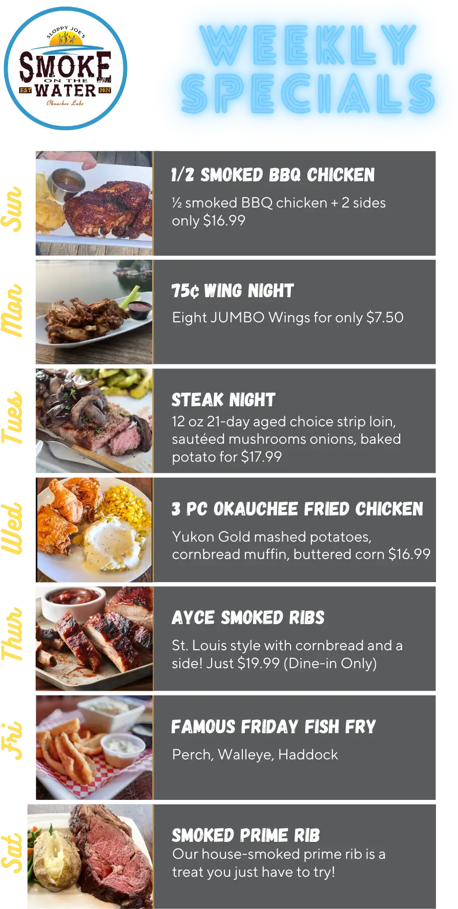 Over the decades, the building now occupied by Smoke on the Water has had many names and many owners. Regardless, the purpose of the building has remained consistent. The property has a raised deck patio overlooking Okauchee Lake with piers and boat slips allowing guests to "come aboard" by land or by sea. Back in the 1950’s there was a thriving bowling alley there, and it was a nightclub in the 90s.